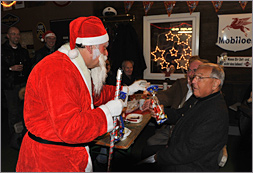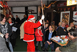Patrick Graeffly und Martin Metzler hatten die mobile Küche schnell auf Touren, so dass der Glühwein im Hinblick auf Temperaturen um 5 Grad um so beliebter war. Doch die Anspannung bei den Kindern stieg zunehmend, da diese auf den Weihnachtsmann warteten, der dann pünktlich gegen 18.30 Uhr die Halle besuchte. Bei Weihnachtsliedern – begleitet an der Orgel von Olga Bruch – stieg die Stimmung so richtig.