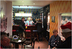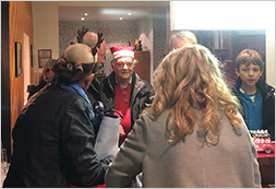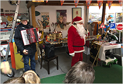 Patrick Graeffly und Martin Metzler hatten sich wieder rechtzeitig um die Beköstigung bemüht, so dass bei Erbsensuppe und Würstchen, Glühwein und Kinderglühwein kurzfristig adventliche Stimmung aufkam. Gerd Magens und sein Schwiegervater hatten draußen Stand für ihre Kartoffelwaffeln aufgebaut, die reißenden Absatz fanden. Pünktlich um 19.00 Uhr kam der Nikolaus auf seinem Opelschlitten vorgefahren. Er wurde von allen Gästen herzlich draußen begrüßt. Nach einem gemeinsamen Lied teilte er für alle Gäste Stutenkerle aus und versprach, im nächsten Jahr wiederzukommen.