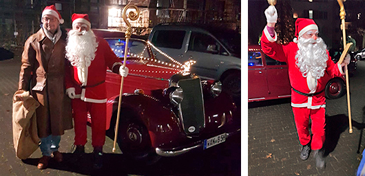 Pünktlich gegen 19.00 Uhr erschien der Nikolaus in seinem Himmelsgefährt: Ein Mercedes-Benz 170 D, Baujahr 1952, in rostrot, festlich geschmückt und chauffiert von Frank Brom. Die Kinder hatten ihre helle Freude, sie hatten dem Nikolaus sogar etwas mitgebracht.