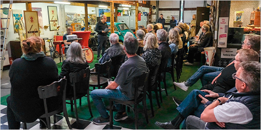 Zu Beginn zeigte Frank Brom, dessen Vater bei der Hülsmann Brauerei beschäftigt war, einen Einführungsfilm zur historischen Entwicklung der Brauerei. Anschließend referierte Wolfgang Bruch zu verschiedenen Einzelheiten, die er u.a. von ehemaligen Mitarbeitern der Brauerei erfahren hatte. Erläutert wurden auch die einst produzierten Biersorten, die unterschiedlichen Gläser, der Wandel der Grafiken sowie die Anzahl der Absatzstätten.