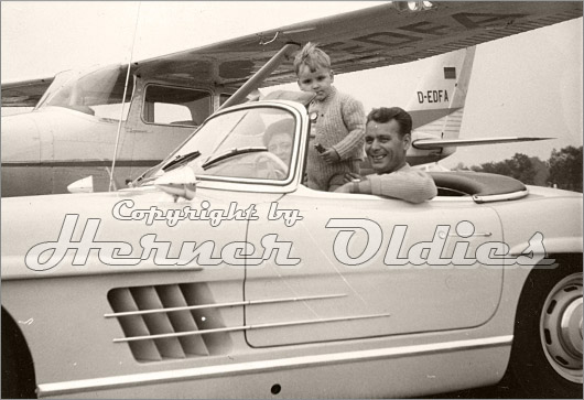 Mit sichtbarem Stolz präsentiert Fritz Teichmann 1960 einen Mercedes 300 SL Roadster auf dem Flugplatz Loemühle. Das Fahrzeug war cremeweiß und hatte eine rote Innenausstattung. Es war in Herne-Wanne zugelassen.
