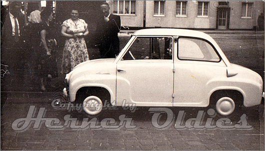 Eine Goggomobil Limousine zeigt dieses Foto aus Wanne-Eickel im Jahre 1958. Man beachte die Vatermördertüren sowie die Einfachheit der Radkappen. Das Bild entstammt der Sammlung von Wolfgang Bruch.