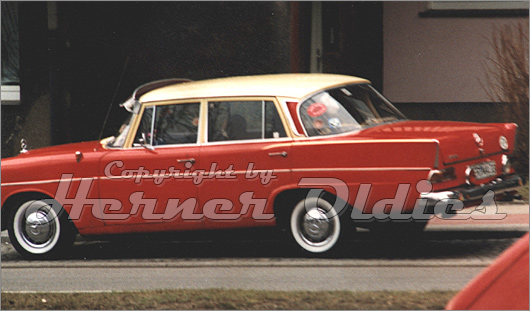 Ein Mercedes Heckflosse zeigt dieses Fotos aus dem Herner Stadtbild, welches aus den siebziger Jahren stammt. Das Fahrzeug wies eine außergewöhnliche Farbgebung sowie erhebliches Zubehör auf.