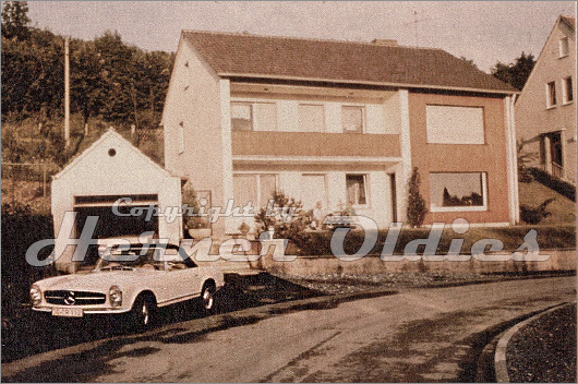 Dieses Bild zeigt eine Mercedes-Benz Pagode 230 SL im Jahre 1964 vor dem Neubau des Besitzers.