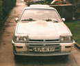 Das Bild zeigt einen Audi 100 Coupé in den 80er Jahren, unmittelbar vor einer VW Werkstatt...