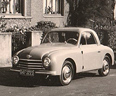 Diese Fotografie aus dem Jahre 1952 zeigt "das Auto mit den 2 Rädern", ein Maicomobil...