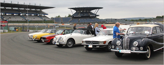 Nach einem längeren Aufenthalt im Fahrerlager haben wir uns dann noch in das alte Fahrerlager begeben. Dort waren Fahrzeuge ausgestellt, die man ansonsten nur bei der Mille Miglia in Italien sieht. Die Stimmung war hervorragend. Der ehemalige Rennsport war überall zugegen. Wir hatten auch das Vergnügen, in die Boxengasse gehen zu können und quasi unmittelbar an der Rennstrecke zu stehen. Nach einer Besichtigung der Werkstatt der Firma Teichmann Racing - dort werden Cup-Porsche umgebaut - haben wir dann den Tag bei einem gemeinsamen Essen in unserem Hotel auf der Terrasse ausklingen lassen.
