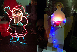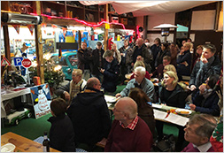 Patrick Graeffly und Martin Metzler hatten sich wieder rechtzeitig um die Beköstigung bemüht, so dass bei Erbsensuppe und Würstchen, Glühwein und Kinderglühwein kurzfristig adventliche Stimmung aufkam. Gerd Magens und sein Schwiegervater hatten draußen Stand für ihre Kartoffelwaffeln aufgebaut, die reißenden Absatz fanden. Pünktlich um 19.00 Uhr kam der Nikolaus auf seinem Opelschlitten vorgefahren. Er wurde von allen Gästen herzlich draußen begrüßt. Nach einem gemeinsamen Lied teilte er für alle Gäste Stutenkerle aus und versprach, im nächsten Jahr wiederzukommen.