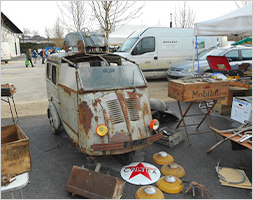 Eine weitere Halle ist komplett bestückt mit örtlichen Clubs. Diese hatten sehr schöne Stände aufgebaut, jeweils aufgegliedert nach Themen und Fahrzeugschwerpunkten. Eine weitere Halle beinhaltete jegliches Zubehör, Plakate, Mode und Schilder. Wie bei jeder französischen Veranstaltung war die Gastronomie im Außenbereich hervorragend bestückt, es gab einen extra Champagnerstand, Spezialitäten aus großen Pfannen, Bierstand, etc. Leider bildeten sich hier in der Mittagszeit ganz erhebliche Schlangen, so dass man doch etwas Geduld brauchte. Gegen Mittag waren wir so ermüdet, dass wir uns entschlossen, vom Veranstaltungsgelände herunterzugehen und nochmals den Oldtimerparkplatz zu besichtigen.