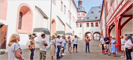 Dort konnten wir den Innenhof befahren und unsere Fahrzeuge auch abstellen. Nach einer Klosterführung begaben wir uns sodann zum Schloss Johannisberg. Auch dort hatten wir unmittelbar vor dem Schloss einen Parkstreifen reserviert, so dass wir an dem nahegelegenen Weinstand eine schöne Mittagspause einlegen konnten. Danach begaben wir uns auf die andere Rheinseite und fuhren zum Schloss Westerhaus.