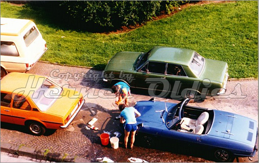 So gestalteten sich Wochenenden Mitte der siebziger Jahre. Es wurde eifrig am Samstagnachmittag (vor der Sportschau) an den Fahrzeugen gearbeitet. Das Bild entstammt der Sammlung von Wolfgang Bruch.