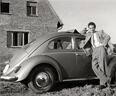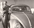 Stolz präsentiert dieser Autobesitzer seinen VW Käfer Ovali mit Faltdach im Jahre 1956 ...