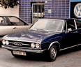Das Bild zeigt einen Audi 100 Coupé in den 80er Jahren, unmittelbar vor einer VW Werkstatt...